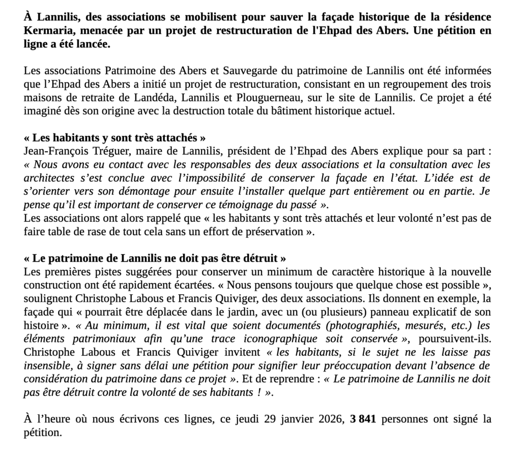 2026.01.30 : pétition pour la sauvegarde de l’aspect historique de la maison de retraite de Lannilis.Christophe30 janvier 2026Dans la presse... Article du Télégramme, 30 janvier 2026 Cette pétition est l’une des réalisations de l’association