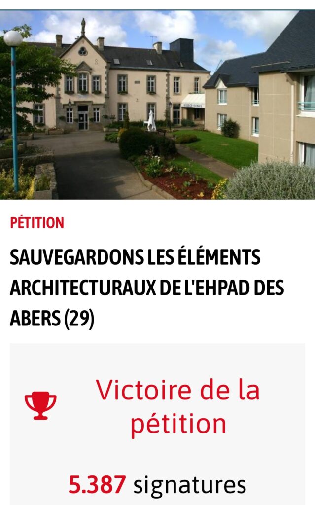 Informés fortuitement que le projet de restructuration de l’EHPAD des Abers comprenait la destruction pure et simple du bâtiment historique principal à Lannilis, les 2 associations en charge du patrimoine de la commune ont fait front commun pour rencontrer les décideurs. Au vu des difficultés mises en avant par ces derniers, une pétition en ligne a été proposée, qui en à peine 5 jours a dépassé les 4000 signatures. Du poids pour le souhait des concitoyens.