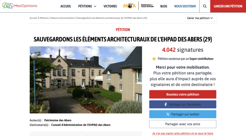 Informés fortuitement que le projet de restructuration de l’EHPAD des Abers comprenait la destruction pure et simple du bâtiment historique principal à Lannilis, les 2 associations en charge du patrimoine de la commune ont fait front commun pour rencontrer les décideurs. Au vu des difficultés mises en avant par ces derniers, une pétition en ligne a été proposée, qui en à peine 5 jours a dépassé les 4000 signatures. Du poids pour le souhait des concitoyens.